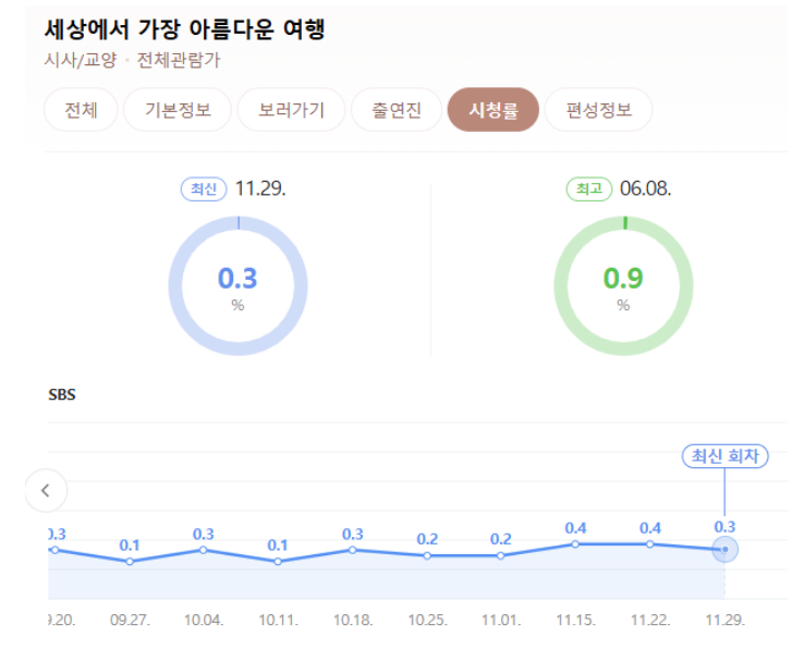 **‘세상에서 가장 아름다운 여행’**은 금요일 오전 11시에 방송되며, 이른 시간대임에도 꾸준한 시청률을 기록했습니다. 프로그램의 진정성 있는 내용과 감동적인 이야기 덕분에 매주 많은 이들이 관심을 갖고 시청하였으며, 특히 주말 아침을 따뜻하게 시작하는 데 큰 역할을 했습니다.